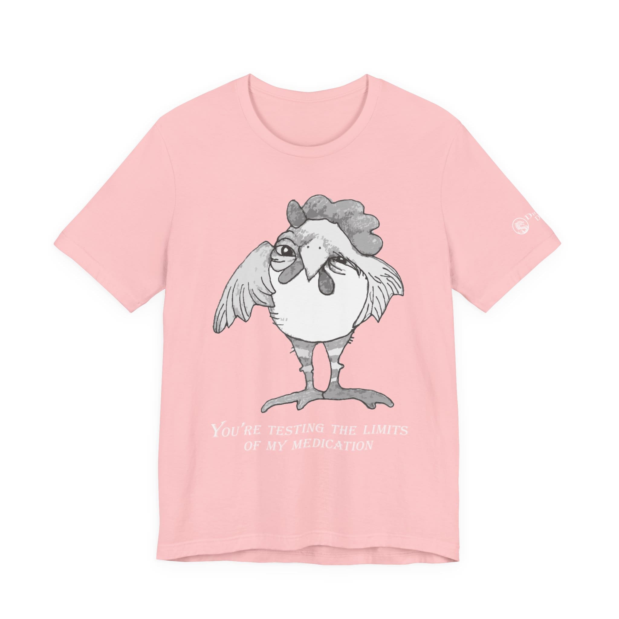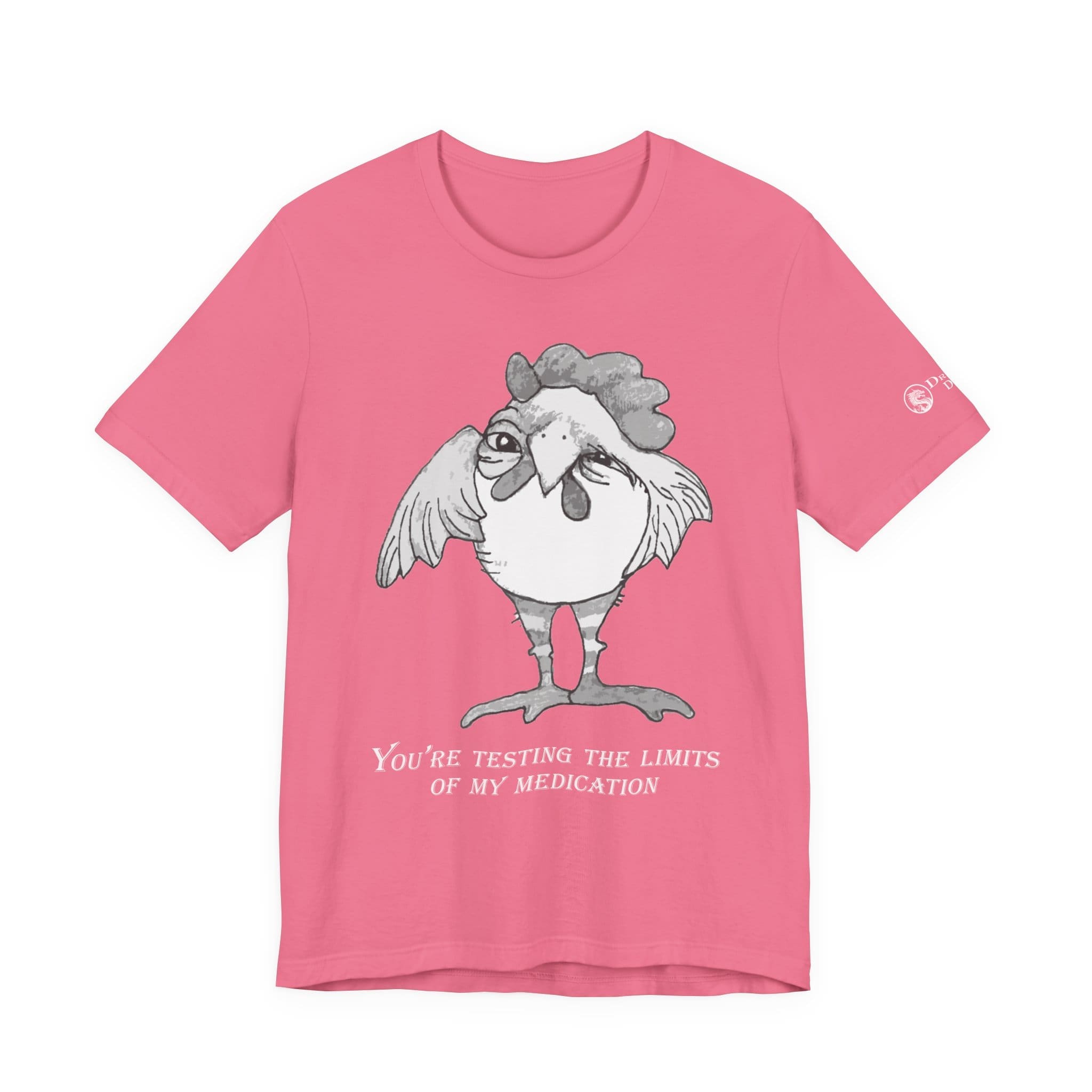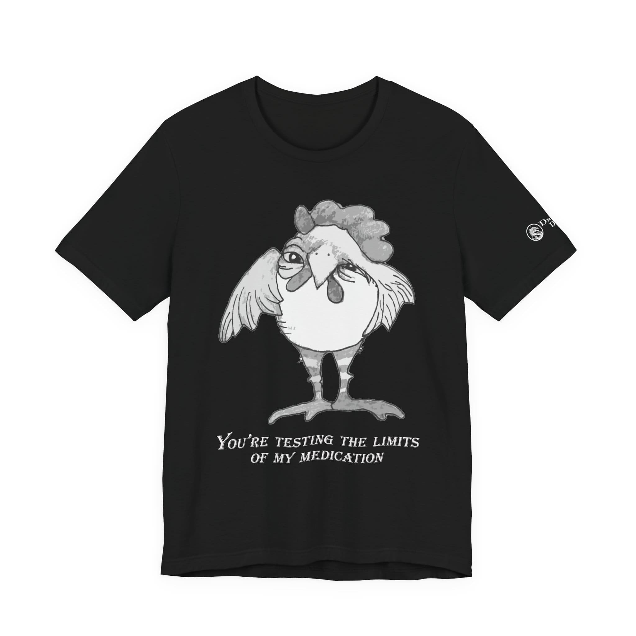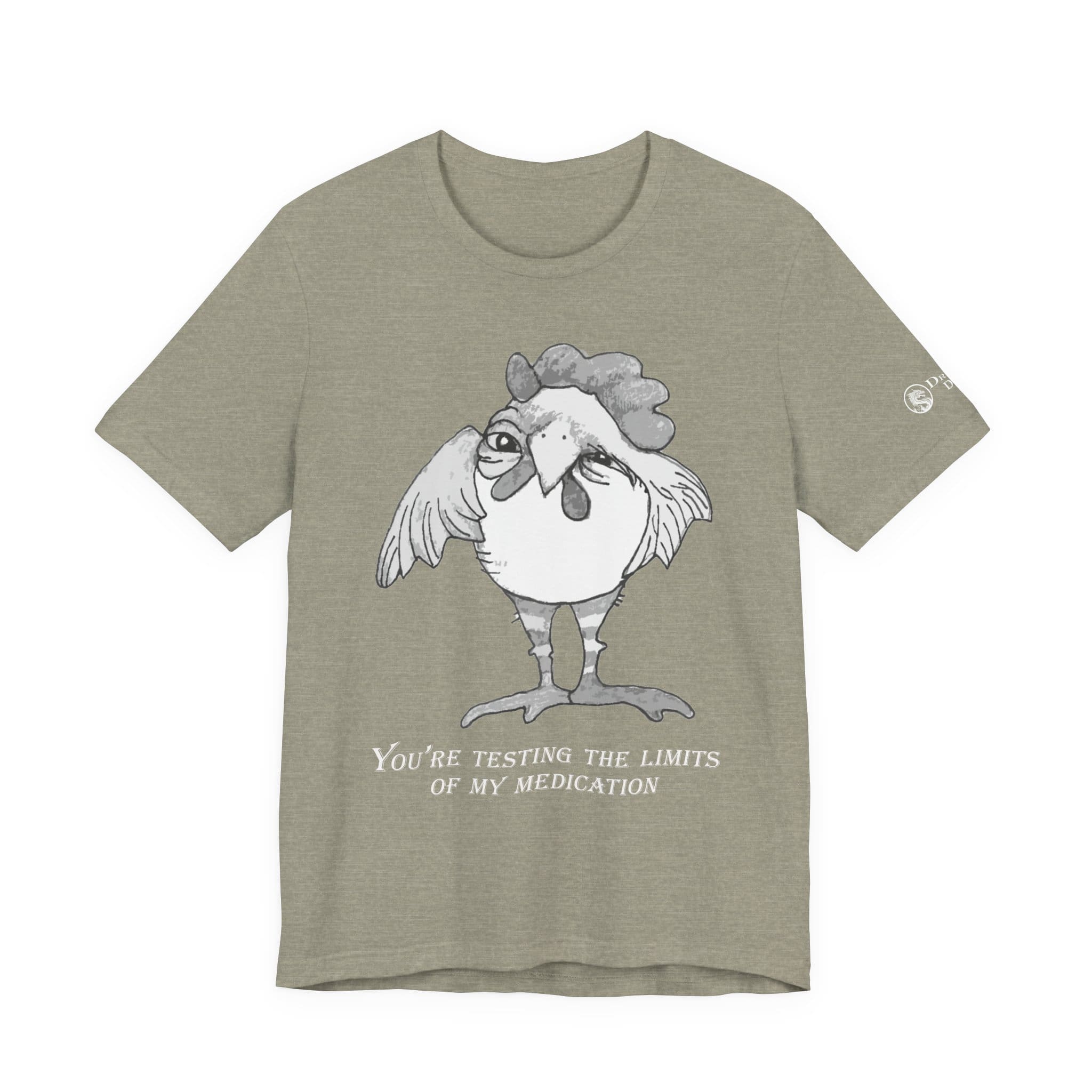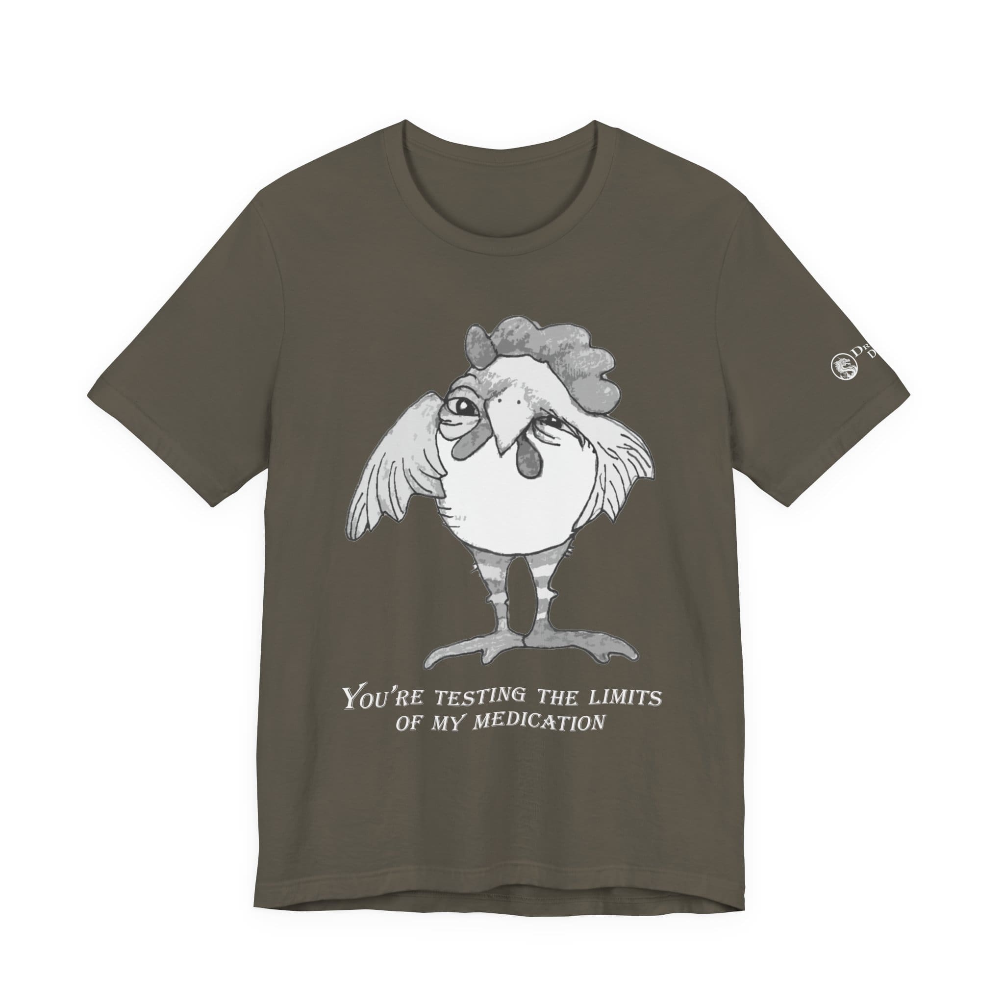 Hand-drawn by the reknown artist EH, this lightweight cotton tee carries a hand-sketched, slightly wild rooster illustration and the slogan “You Are Testing The Limits Of My Medication”, that feels playful and a little bit rebellious. Wear it when you want to nudge the ordinary — the drawing’s uneven lines and quirky expression spark conversation and show off a low-key, expressive sense of humor. It layers easily under a jacket or stands alone with jeans for a morning at the farmer’s market, sketching session, or late-night hangout. The soft Airlume cotton keeps you comfortable all day while the retail fit maintains a neat silhouette, letting the artwork take center stage.