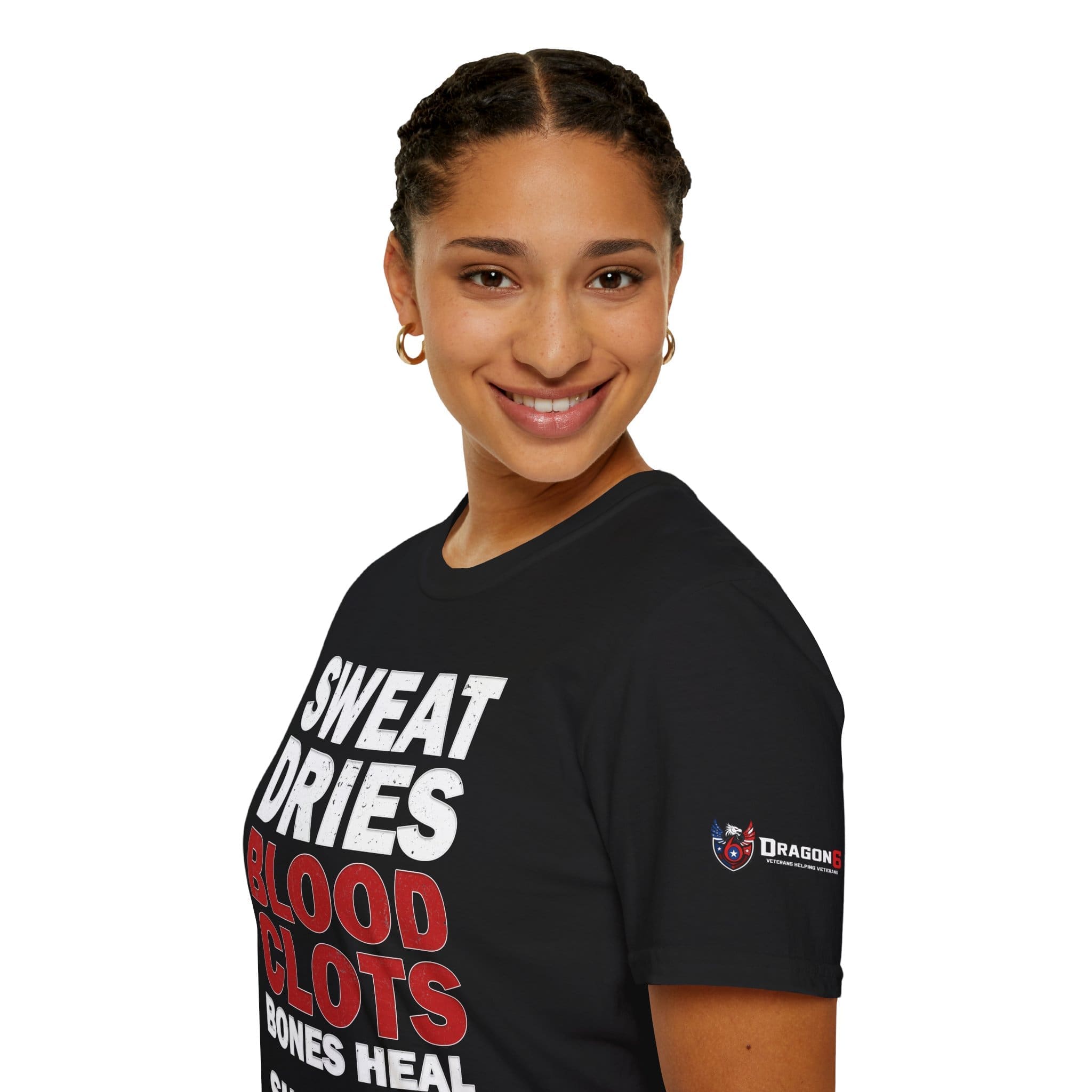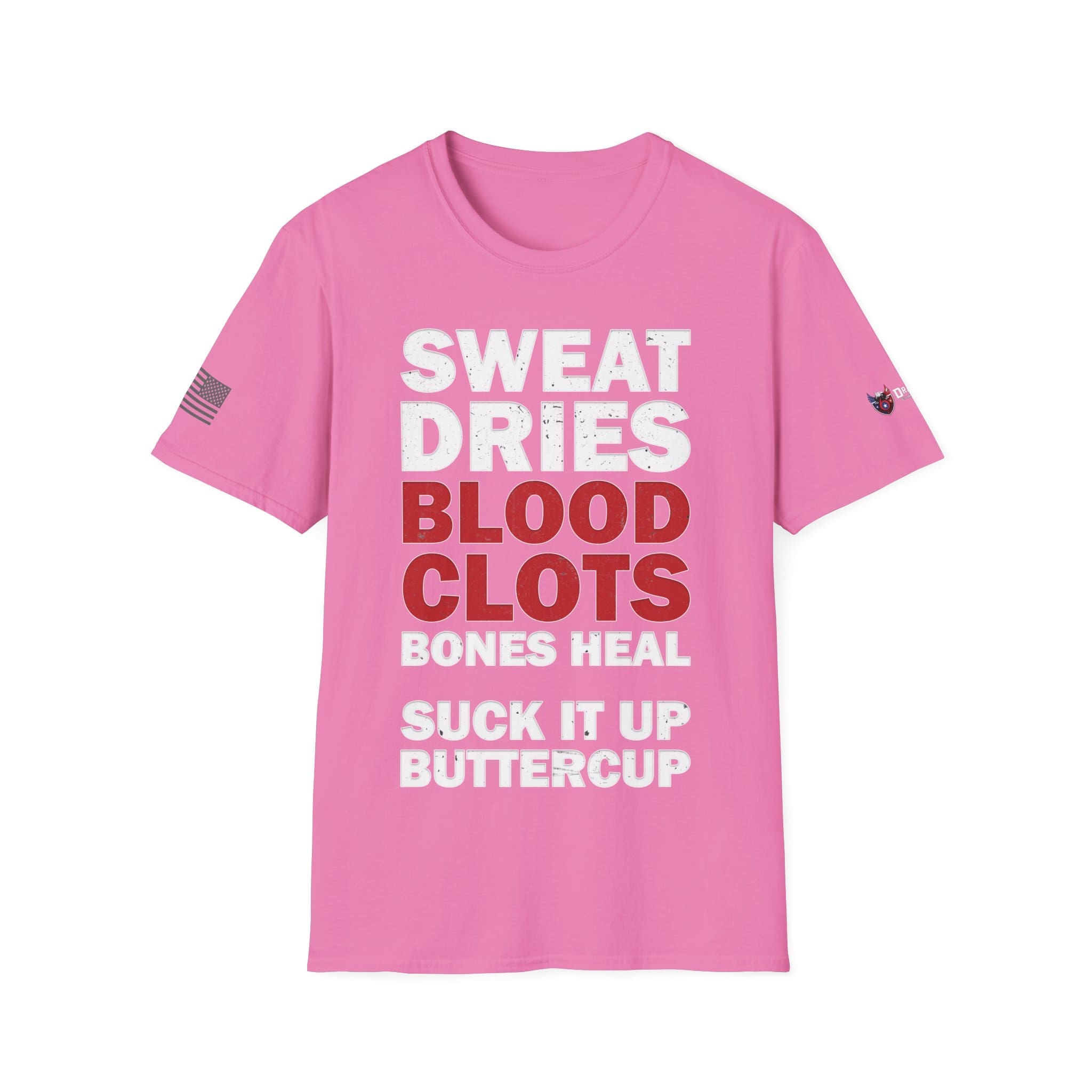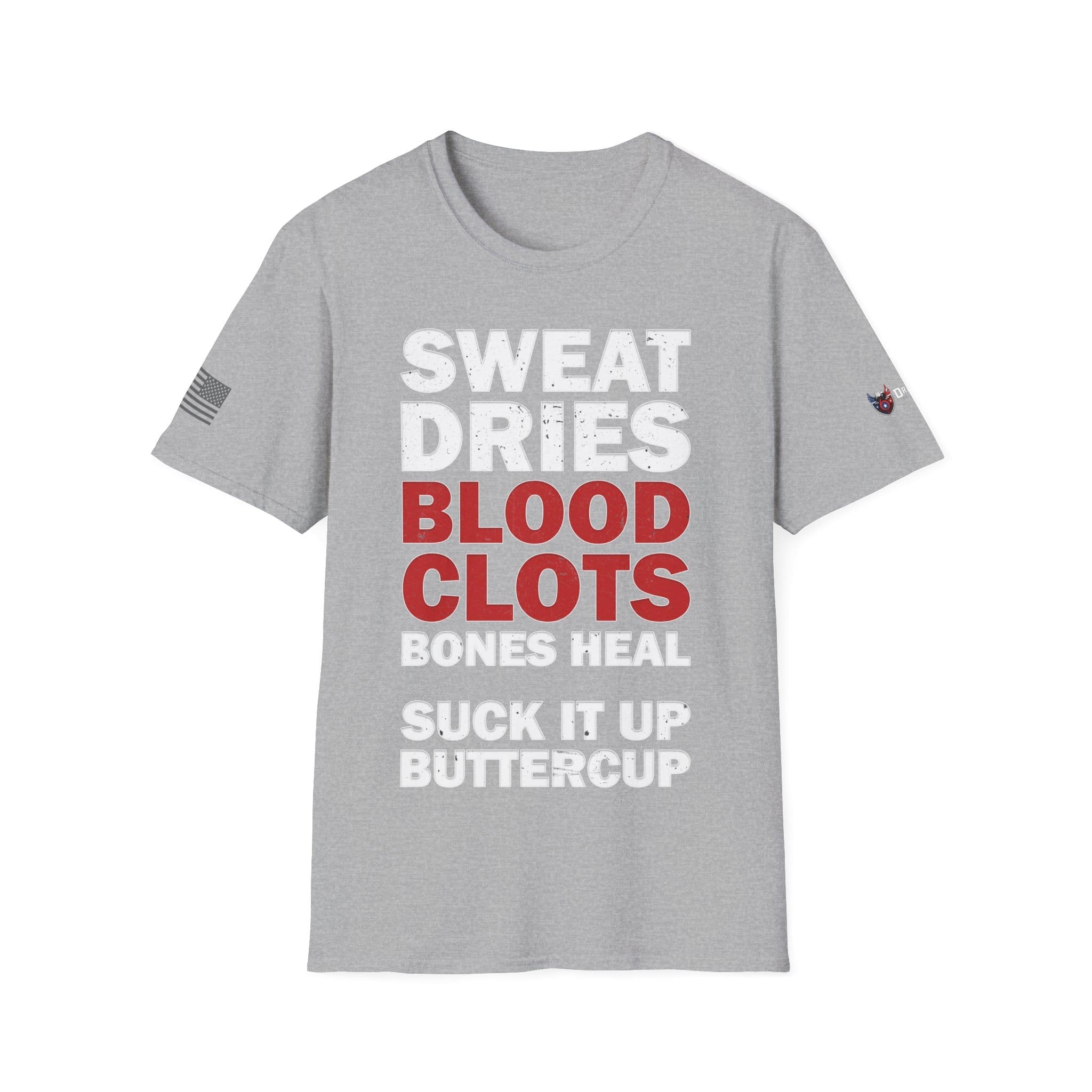 Our “Sweat Dries, Blood Clots, Bones Heal — Suck It Up Buttercup” t-shirt is specifically designed for Veterans, Active Military, LEO & First Responders. This tee speaks like a teammate who won’t let you quit. Bold block type declares grit and dark humor across the chest — a short mantra for pushing through hard workouts, muddy trails, and long shifts. The soft, lightweight cotton sits close to the body without feeling heavy, while the clean crew neck and classic cut make it easy to layer under a hoodie or wear on its own. Subtle sleeve accents add quiet attitude without stealing the message. Wear it when you need a little shove from your own wardrobe: to the gym, out running errands after a dawn session, or for a day of yard work that turns into sweat and stories.