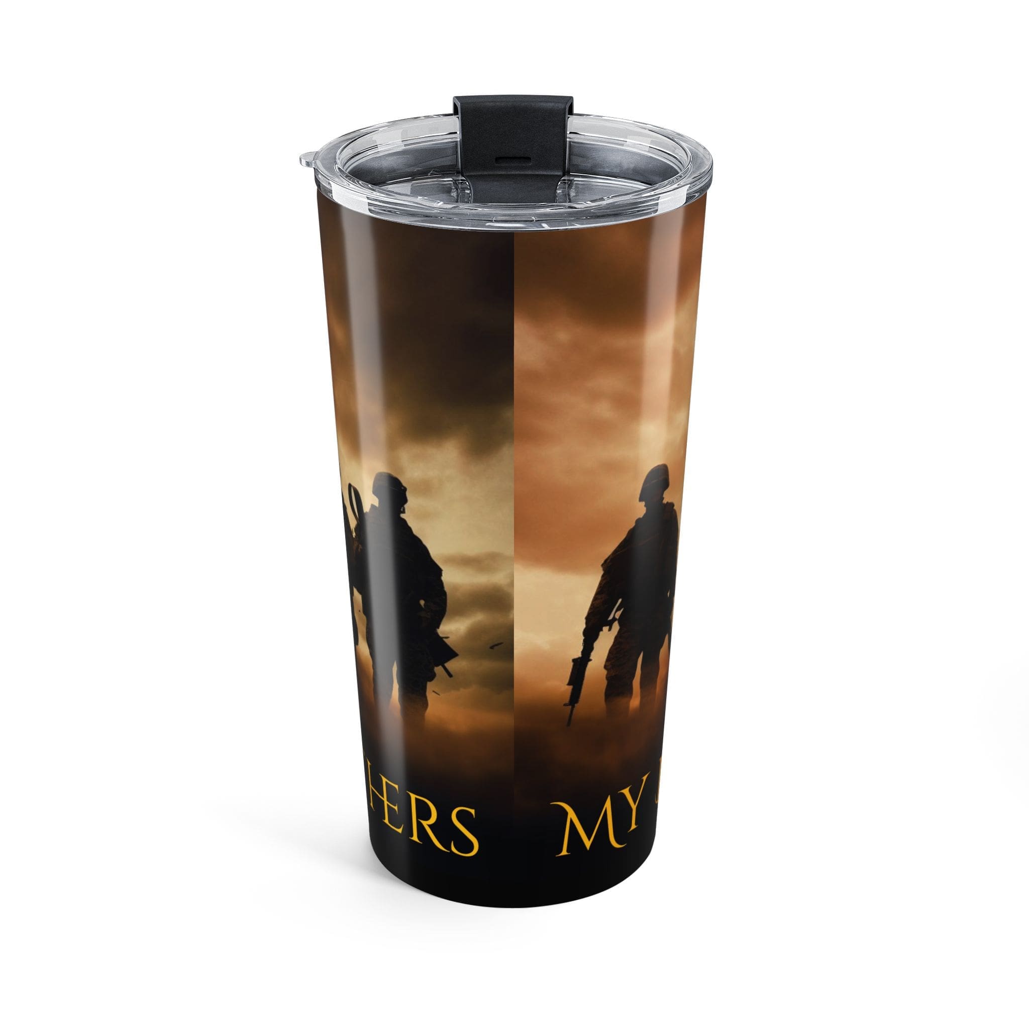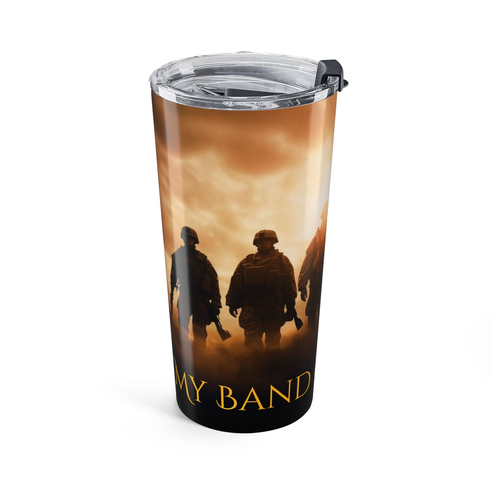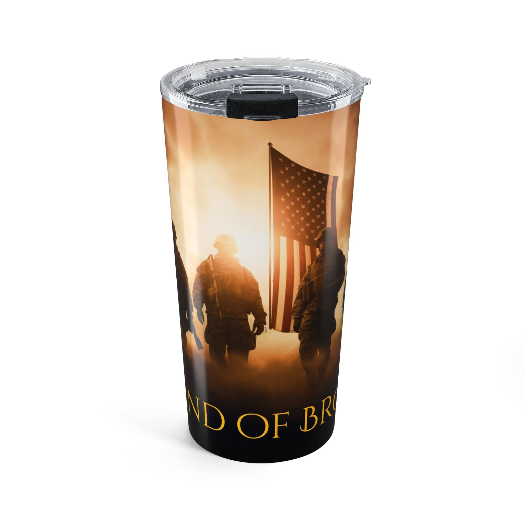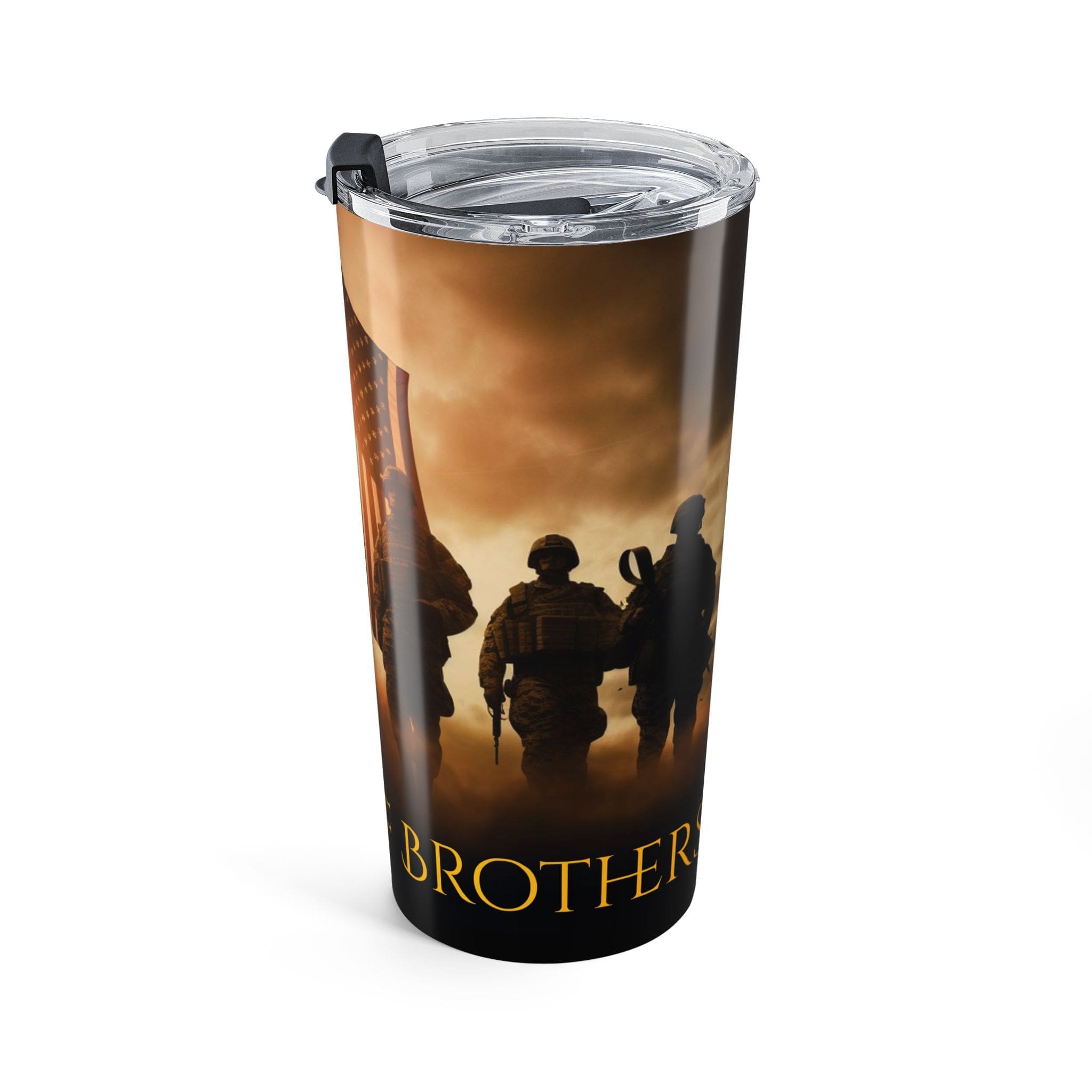 Our Veteran Tribute Tumbler 20oz — “Band Of Brothers” Military Travel Mug is a 20oz stainless steel tumbler carries a quiet, gritty tribute—soldiers silhouetted against a warm, sunrise sky with a waving American flag. It feels like the first sip after a long watch: steadying, warm, familiar.