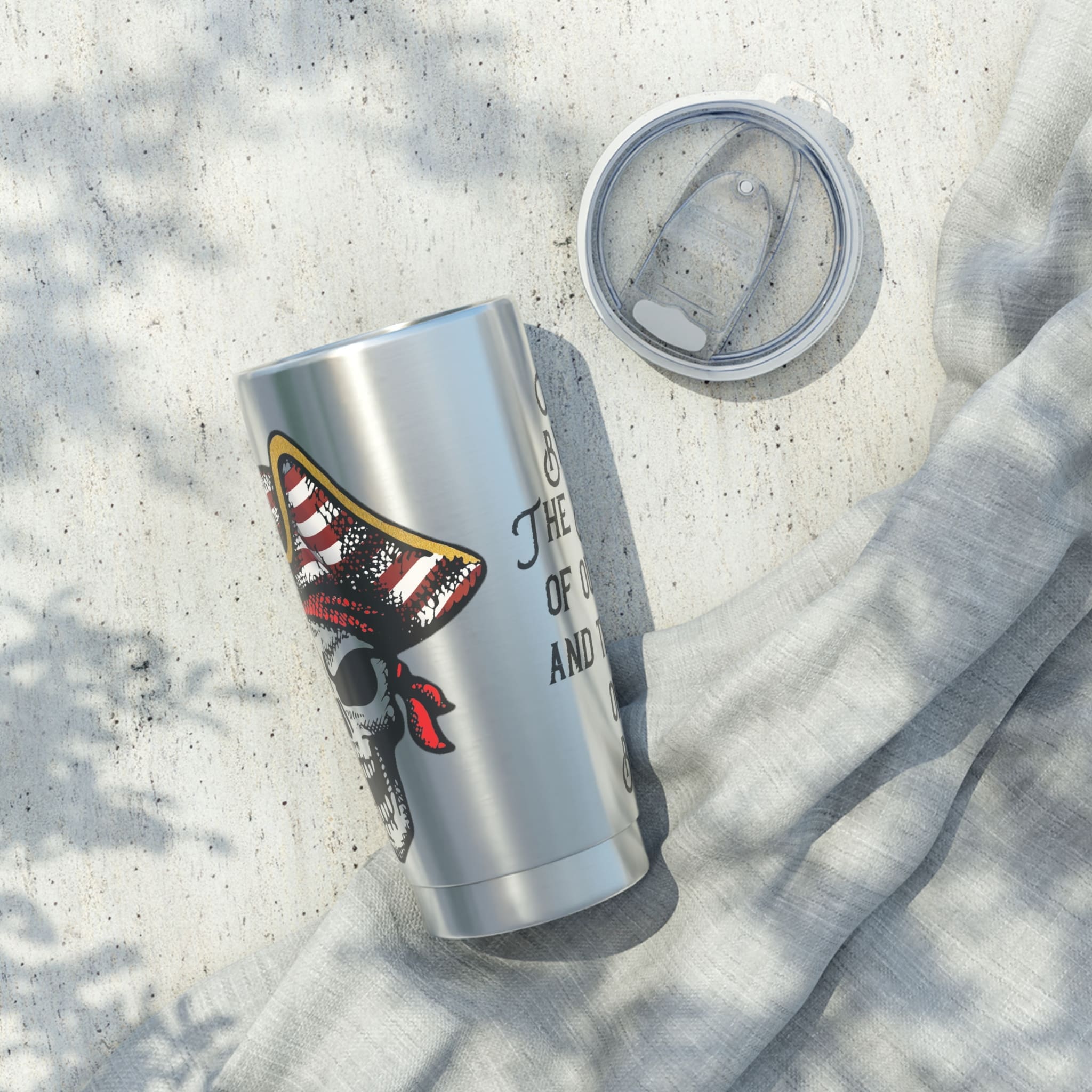 Our Patriotic Skull 20oz Travel Tumbler — “By the Strength of Our Backs and the Sweat of our Brows” Patriotic Pirate Skull Design, ‘Vagabond’ Insulated Cup has a quote that feels rugged and personal. It slides into a cup holder, keeps your drink hot or cold for hours with its double-wall insulation, and the spill-resistant sliding lid with rubber gasket lets you move without anxiety. The vibrant print holds up over time, so the skull-and-bandana motif stays sharp whether you’re on a road trip, at a coastal campsite, or finishing a long shift. It’s built to be carried, used, and trusted — the kind of tumbler that becomes part of your routine and shows a bit of your edge.