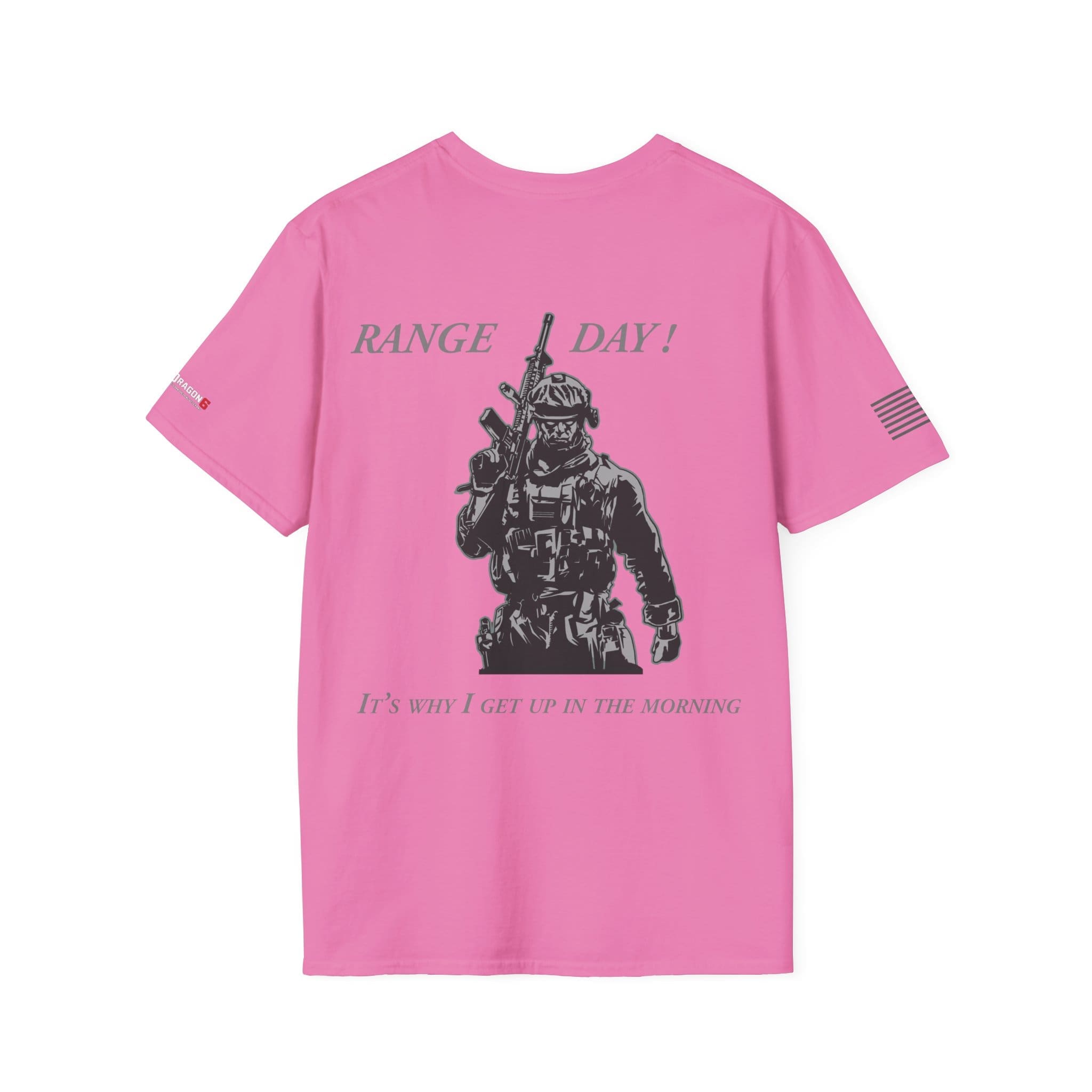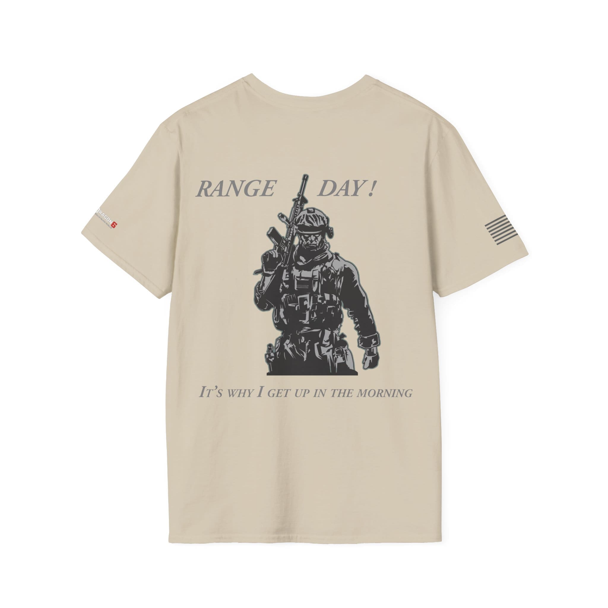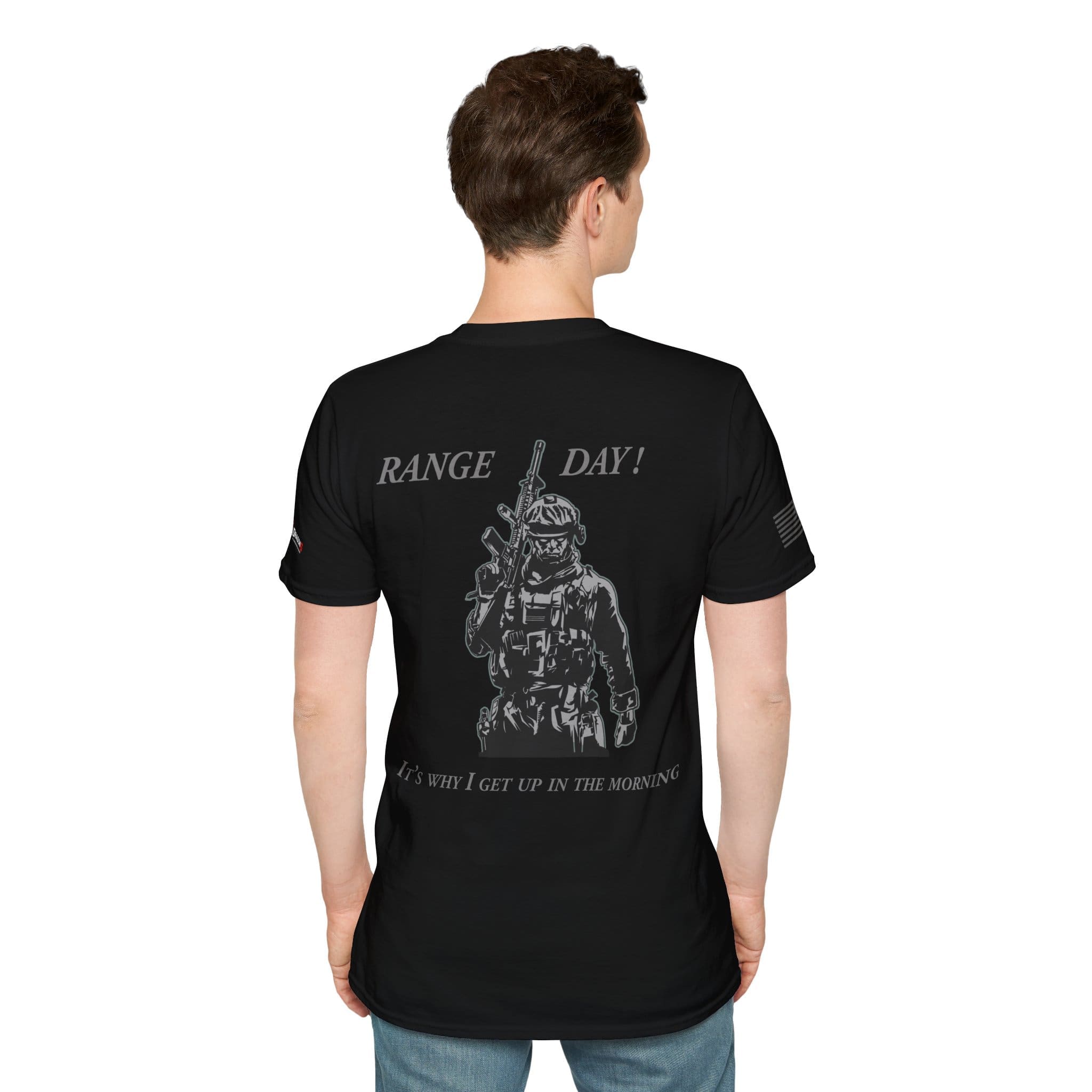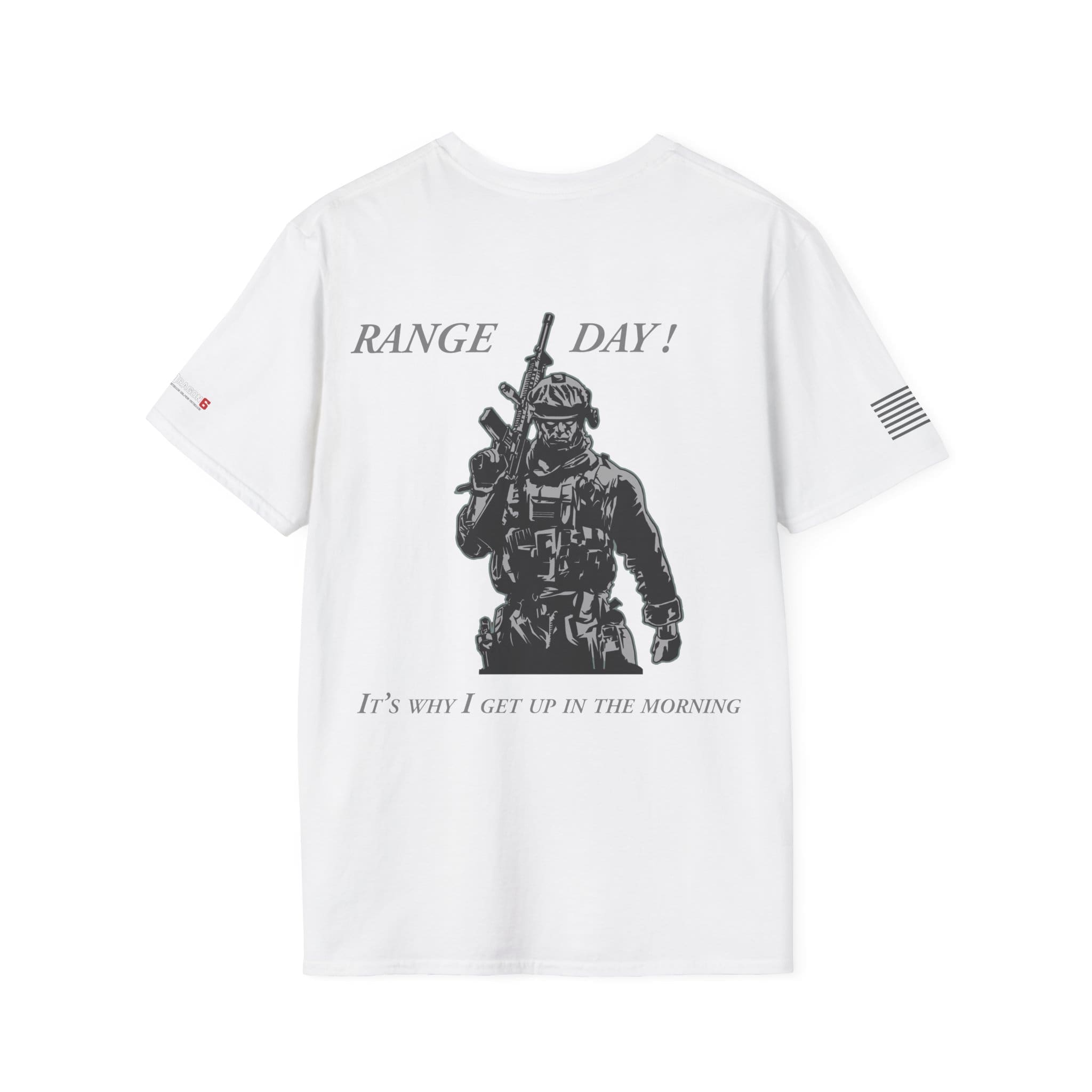Our Range Day T-Shirt — “Range Day! It’s Why I Get Up In The Morning” Veteran Military Tee is a clean, breathable cotton tee that speaks to people who live for the range and the ritual of training. The shirt features a sharp monochrome back print of a tactical shooter and bold ‘RANGE DAY!’ lettering, with subtle sleeve flags for a low-profile, confident look. Lightweight and soft, it layers easily under a jacket or wears solo on warm days. Built for movement and long wear — from the coffee stop before the range to the lane work and the slow ride home — it feels like part of the routine rather than just another top in the closet.