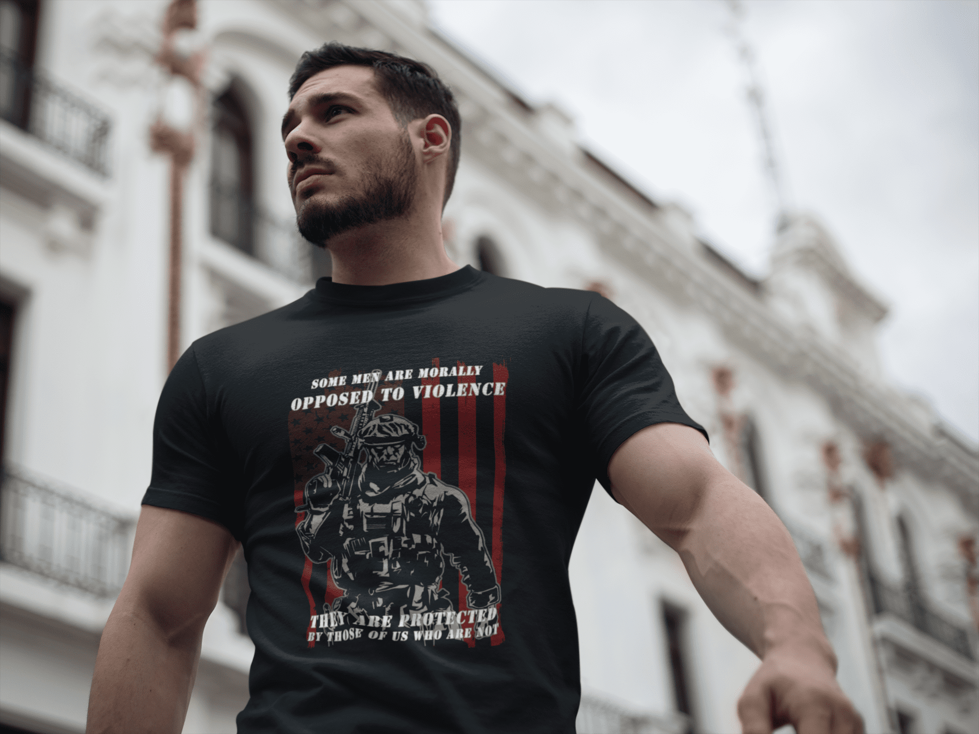 This tactical military graphic tee carries a quiet, hard-edged conviction. The bold “Some Men Are Morally Opposed to Violence They Are Protect By Those Of Us Who Are Not” statement sits against a stark, utilitarian design that reads like field gear and speaks to values over bravado. If you’re searching for the Some Men Are Morally Opposed to Violence Tactical Military Graphic Tee — T-Shirt, you’ll find it delivers on both message and style. Wear it on runs to the range, at vets’ gatherings, or while slipping into town — it feels grounded and steady against the noise. The shirt’s clean crew neckline and classic fit let the message lead without shouting. It settles in easily under a jacket or over worn denim, the kind of piece that becomes part of a daily uniform for people who prize restraint, principle, and clarity of stance. The slightly textured natural option shows subtle flecks that lend an honest, lived-in look, while durable printing methods keep the graphic sharp through repeat wears and washes.