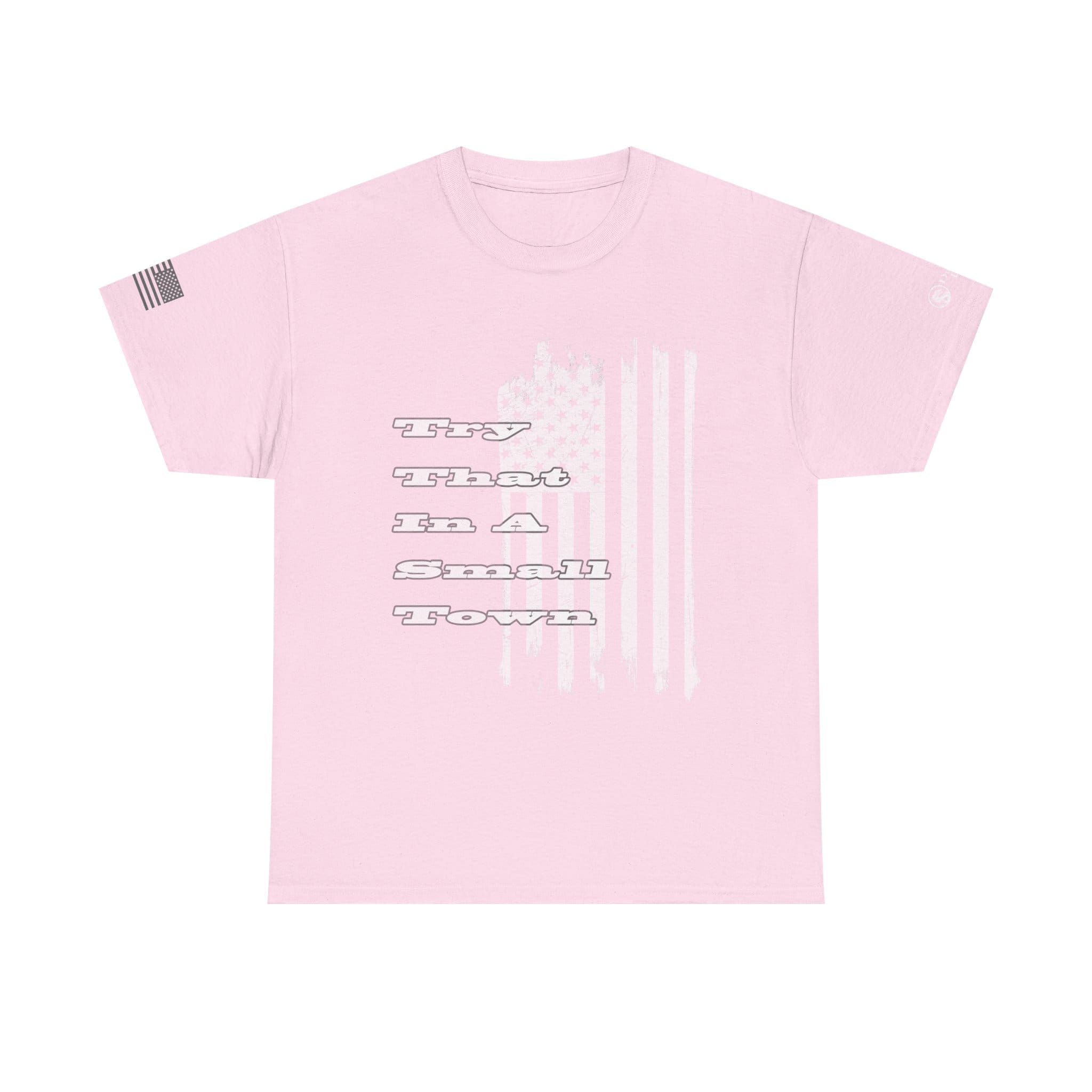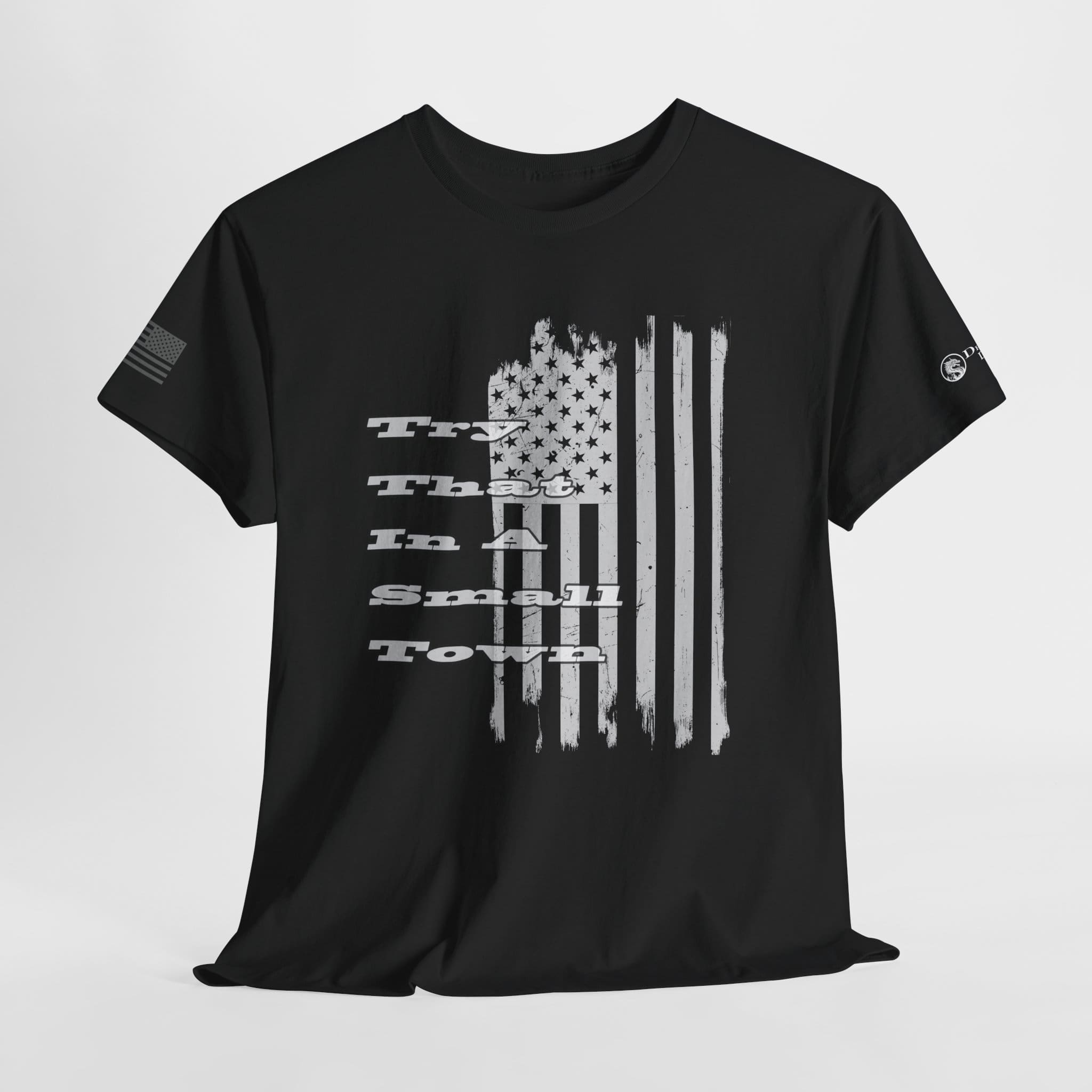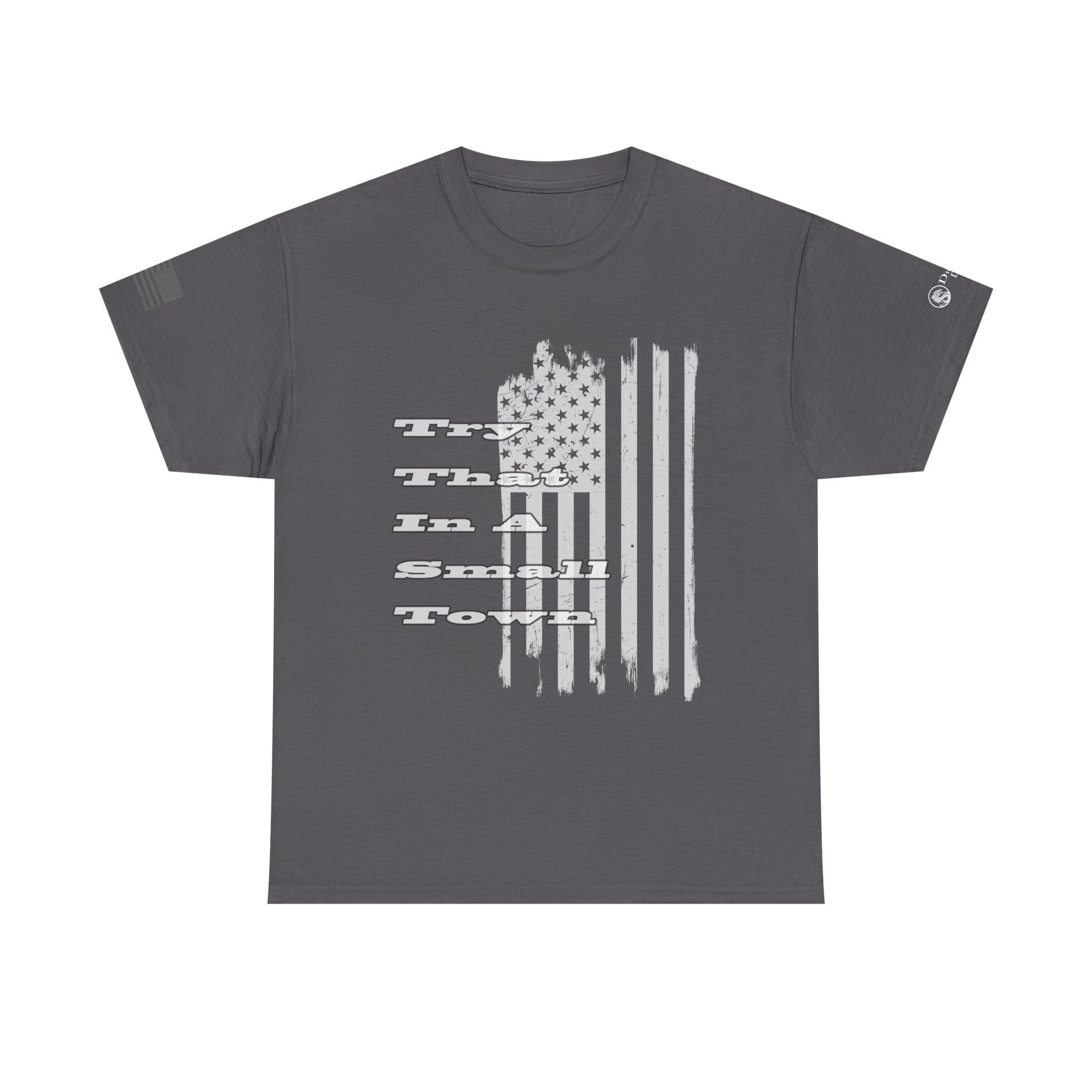 This cotton tee carries the easy rhythm of small-town life and American pride. Emblazoned with the “Try That In A Small Town” on the from with the subdued American flag and Dragon6 logo on the sleeves, it harkens to small town America with slow mornings at the diner, porch light flickers, and friendly nods from neighbors.